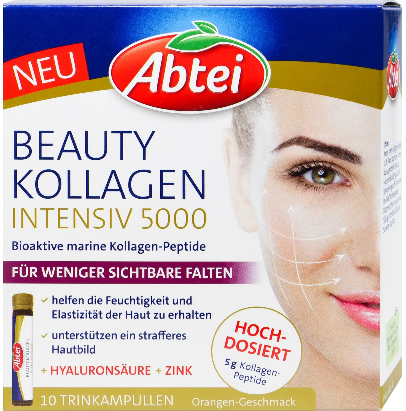 Abtei Beauty Kollagen Intensiv 5000 ist ein Körperpflegeprodukt für die Haut. Die Haut produziert im Alter zunehmend weniger Kollagen, ein Strukturbestandteil der für eine straffe Haut zuständig ist. Die Kombination aus bioaktiven marinen Kollagen Peptiden und Hyaluronsäure sorgt dafür, dass die Haut fester erscheint und durch die Anwendung ein jüngeres Erscheinungsbild erreicht werden kann.