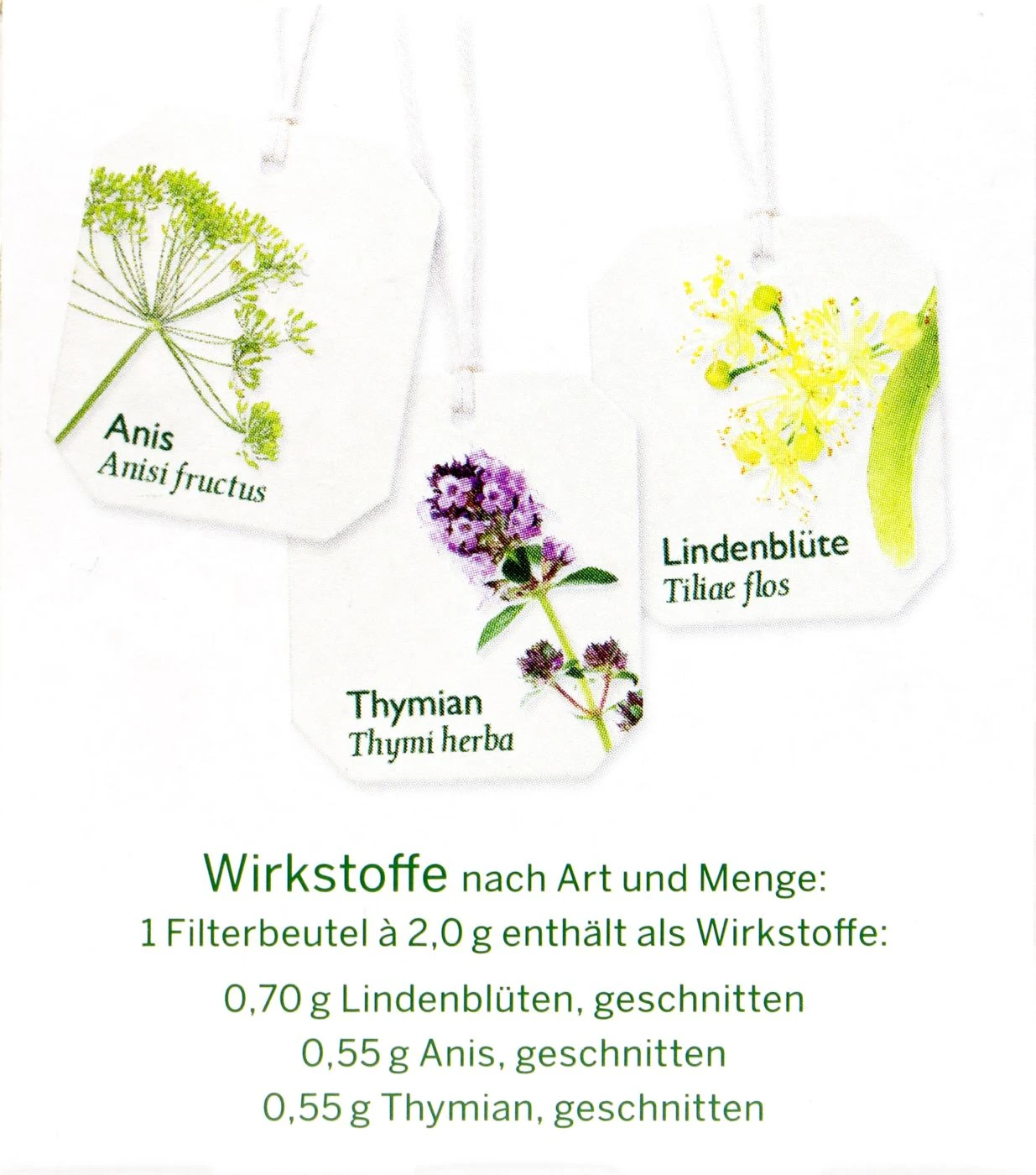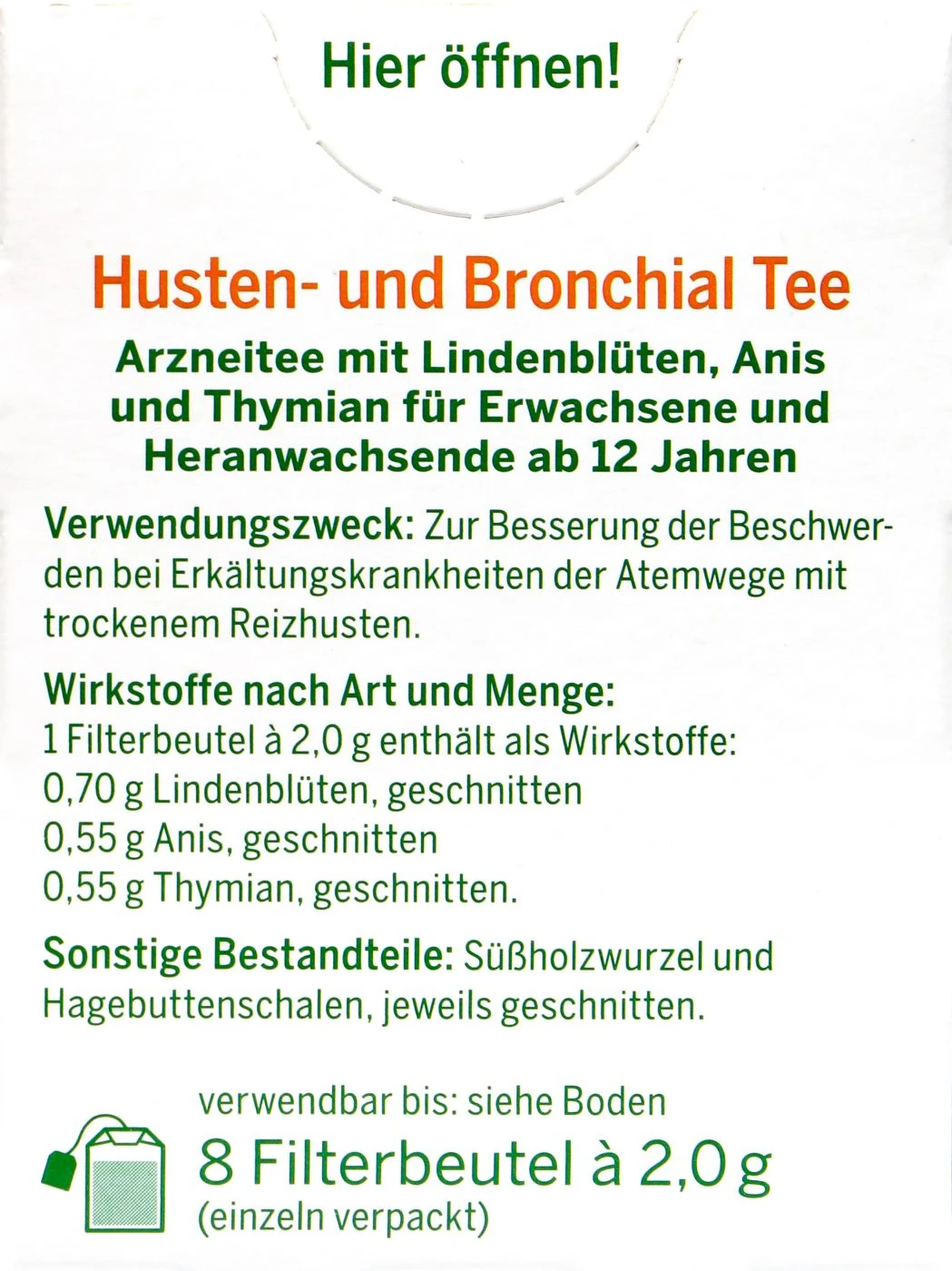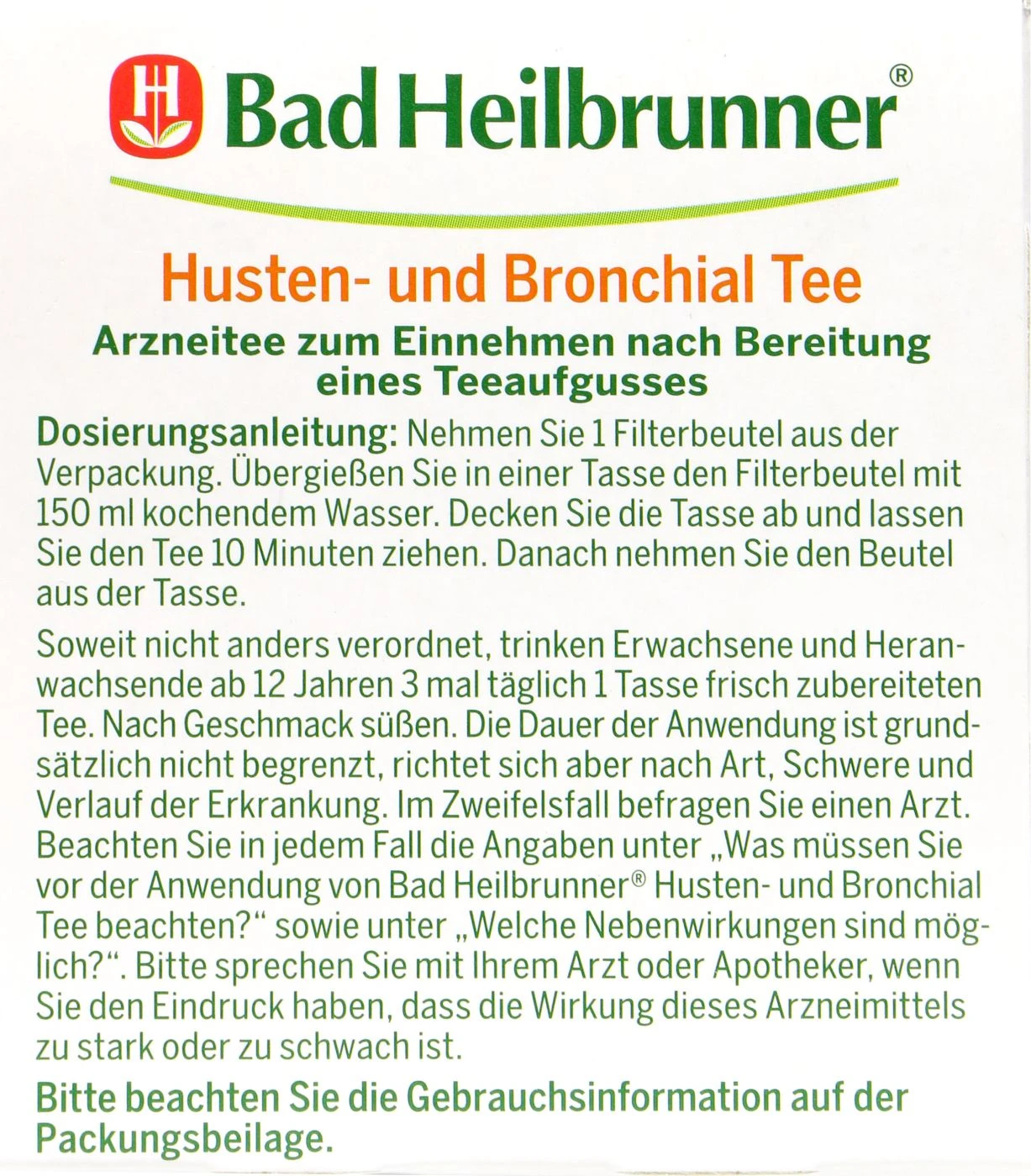 Bad Heilbrunner Husten- und Bronchialtee ist ein Arzneitee. Der Tee ist ein Produkt zur Milderung von Reizhusten und Lösung von Schleim. Der wohltuende Tee besteht aus natürlichen Zutaten wie Anis, Thymian und Lindenblüte. Die Beutel sind biologisch frei von Metallklammern.