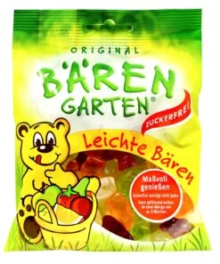 Bärengarten Leichte-Bären ist ein Fruchtgummiprodukt. Die Bärchen sind zuckerfrei und enthalten rein natürliche Aromen. Eine Tüte ist mit den Geschmacksrichtungen Erdbeere, Apfel, Zitrone, Orange, Birne und Kirsche gefüllt.