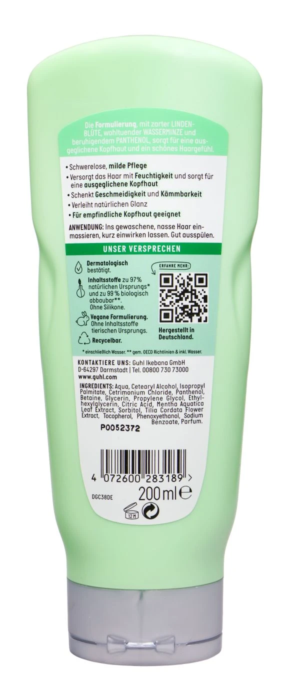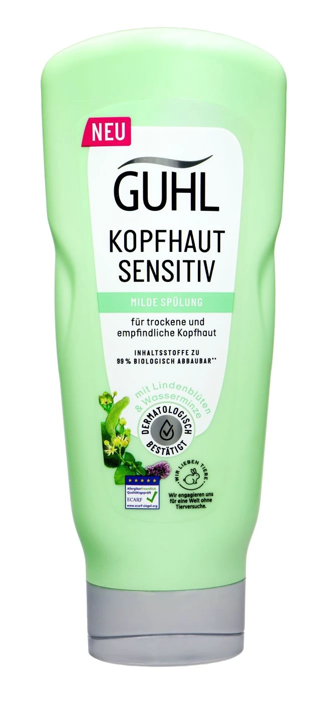 Guhl Spülung Kopfhaut Sensitiv Lindenblüten + Wasserminze, 200 ml ist ein Haar- pflegemittel. Diese milde Spülung eigenet sich besonders gut für die trockene und empfindliche Kopfhaut. Sie versorgt das Haar mit Feuchtigkeit, macht es kämmbar und geschmeidig. Allergikerfreundlich.