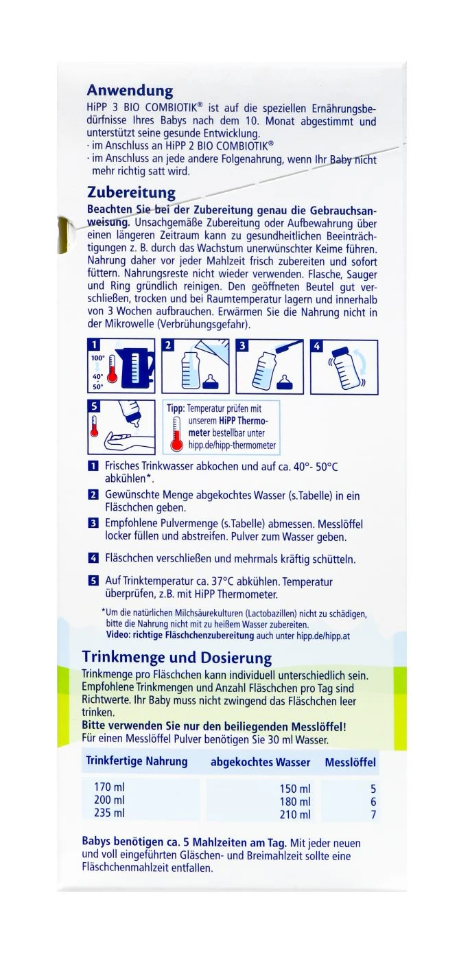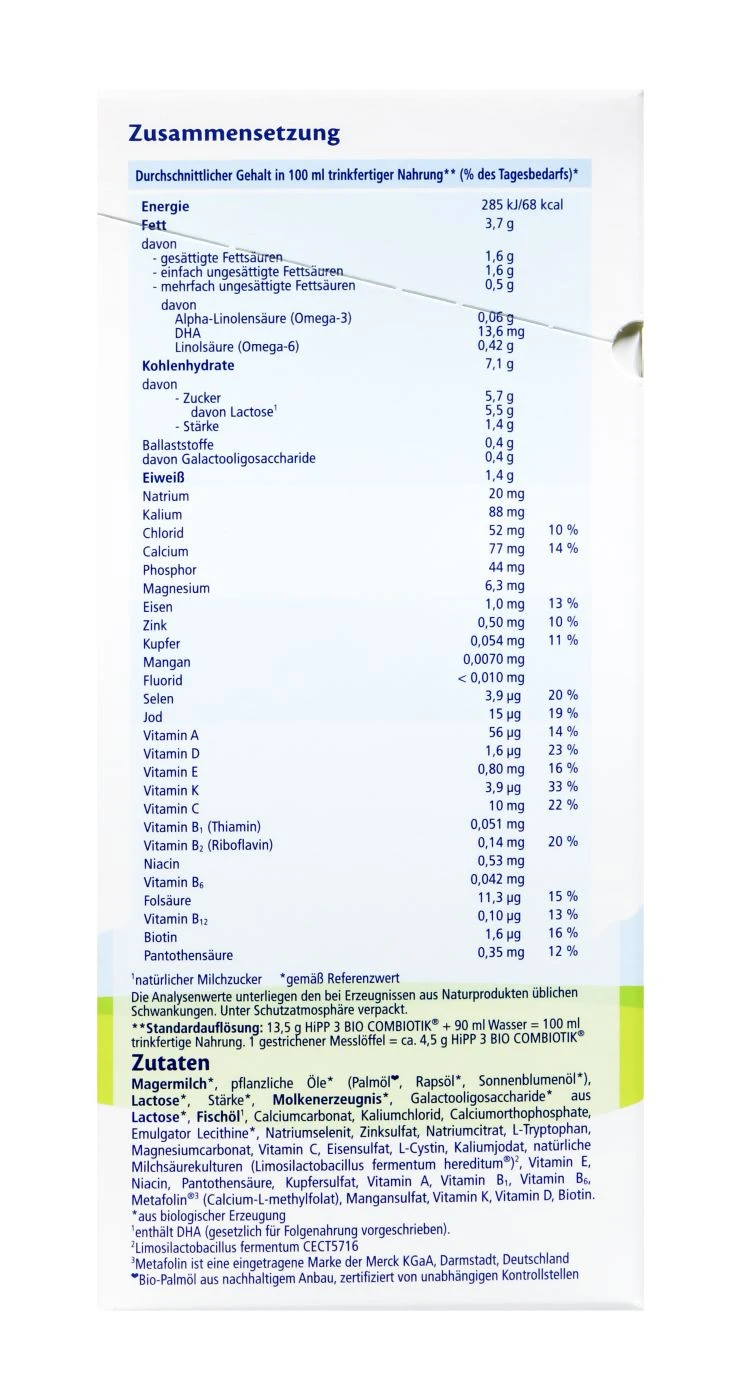 Die Hipp Bio Combiotik bietet alle wichtigen Nährstoffe für die Ernährung eines Säuglings ab dem 10. Monat. Die Folgemilch enthält wichtige A, C und D Vitamine für das Immunsystem des Babys. Sie eignet sich sehr gut als Folgenahrung nach der Stillzeit und liefert wertvolle Energie für das Baby.