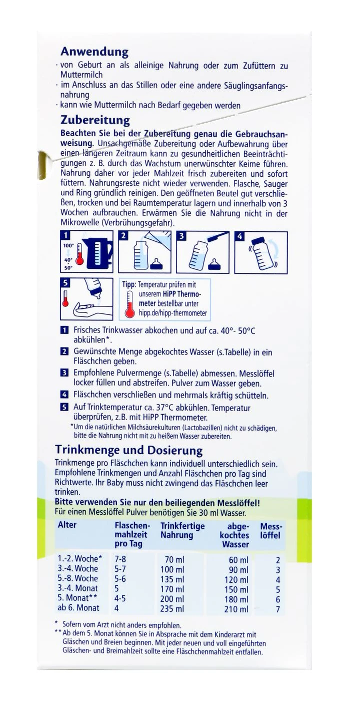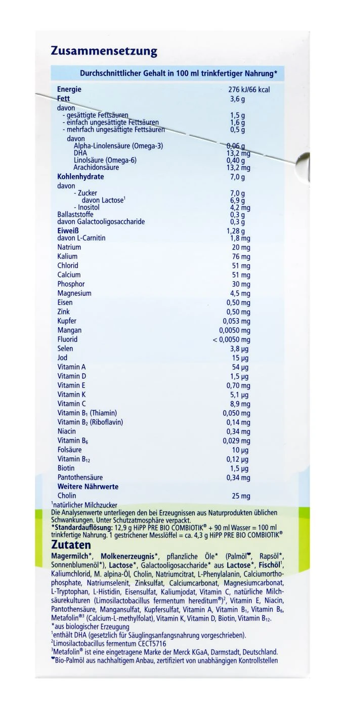 Hipp Bio-Anfangsmilch Pre Combiotik ist mit seinen Bio Zutaten und Inhaltsstoffen dem Vorbild der Natur nachempfunden. Sie kann, genau wie Muttermilch, unbegrenzt zugeführt werden. Ballaststoffe, Milchsäurekulturen und LCP sind speziell auf das Wohl des Kindes angepasst.