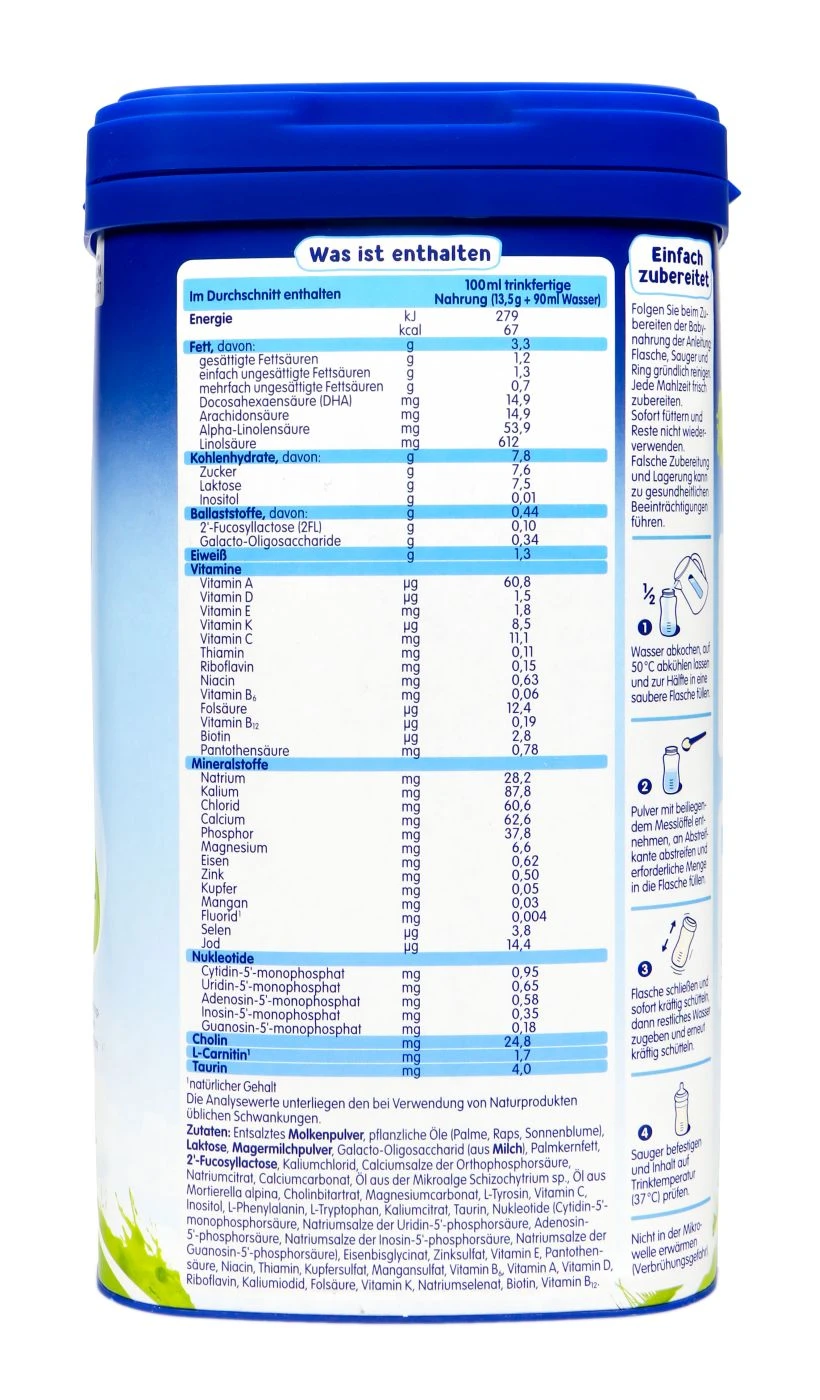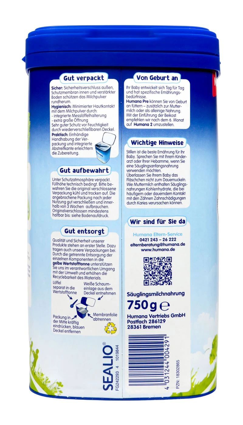 Humana Pre Anfangsmilch ist ein Kindernährmittel und für die Ernährung ab der Geburt an geeignet. Das Produkt kann sowohl zusätzlich zur Muttermilch als auch als alleinige Nahrungsquelle verwendet werden. Sobald Beikost hinzugefügt wird, sollte ab dem 6. Monat auf Humana 2 umgestellt werden.