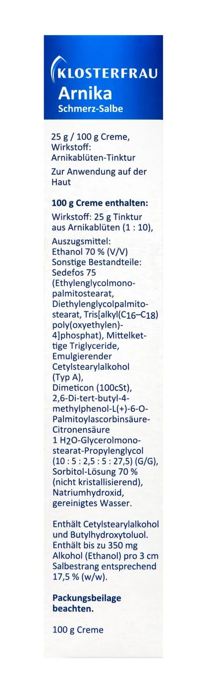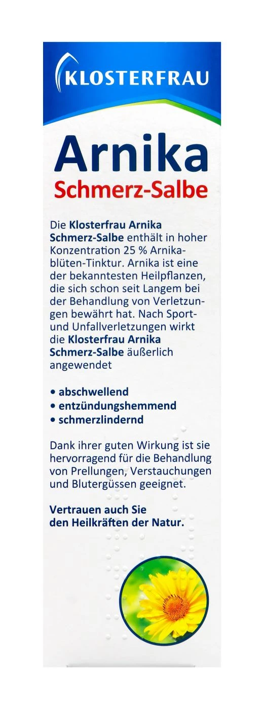 Klosterfrau Arnika Schmerz-Salbe ist eine pflanzliche Salbe zur Schmerzlinderung und Entzündungshemmung. Die Salbe wirkt durch eine hochdosierte Arnikablüten-Tinktur. Durch die natürlichen Inhaltsstoffe werden Schwellungen reduziert und Schmerzen beseitigt.