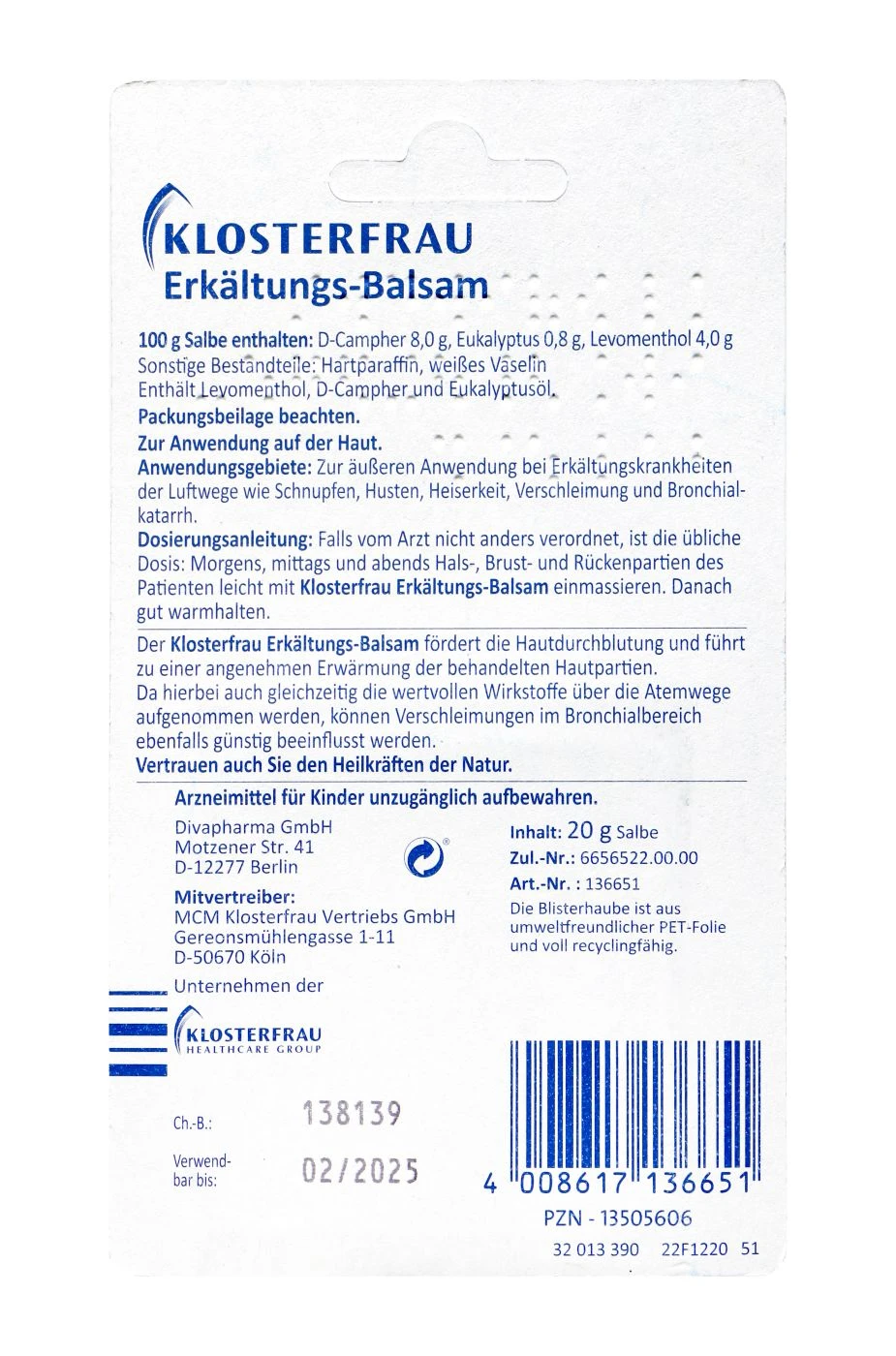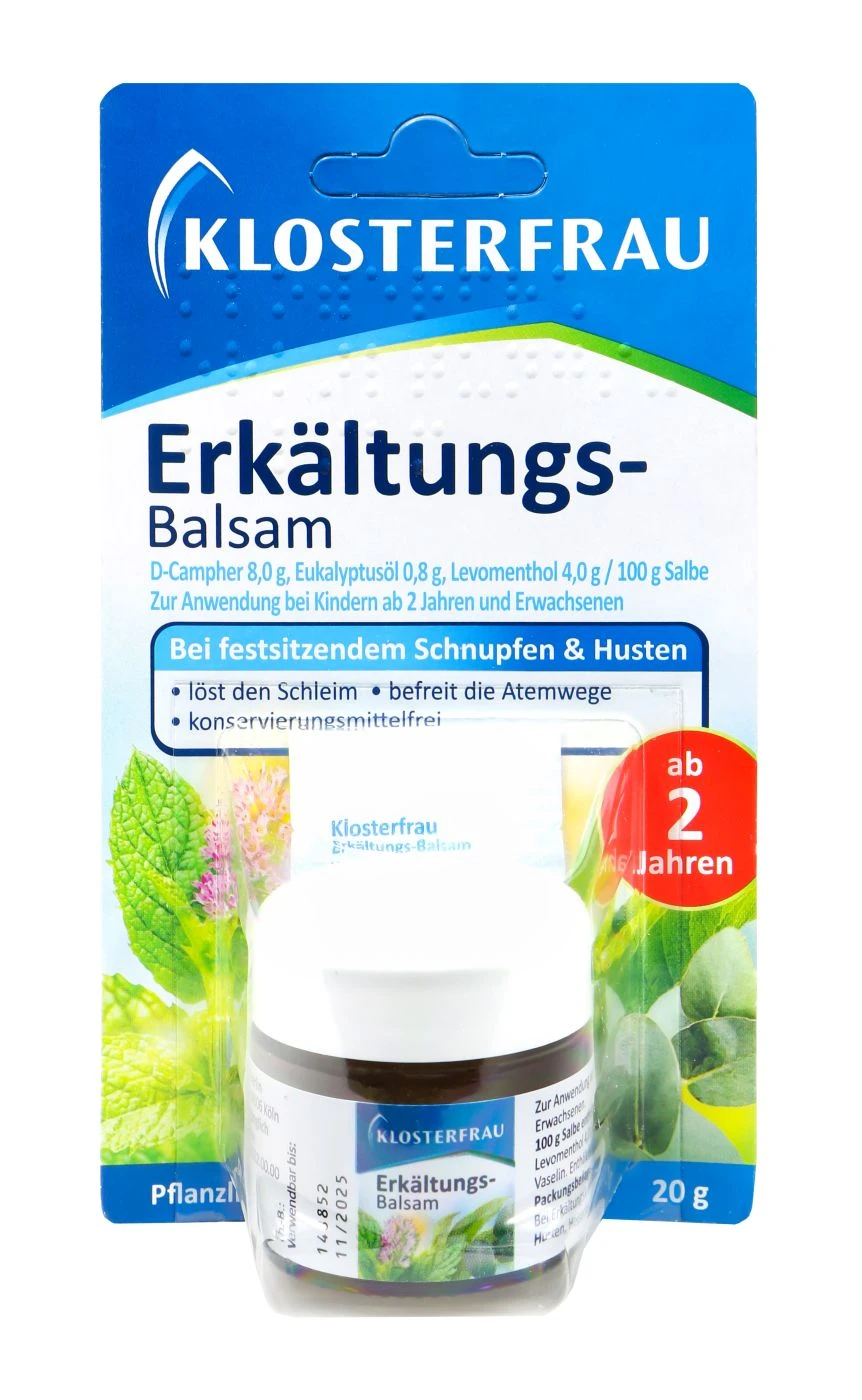 Klosterfrau Erkältungsbalsam ist ein pflanzliches Arzneimittel mit Eukalyptusöl, Levomenthol und D-Campher. Der Balsam wird wie eine Salbe aufgetragen und entfaltet seine Wirkung von selbst. Festsitzender Schnupfen und Husten werden gelöst und die Atemwege wieder frei.