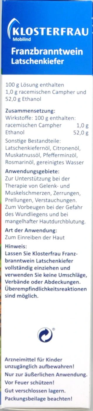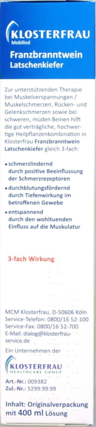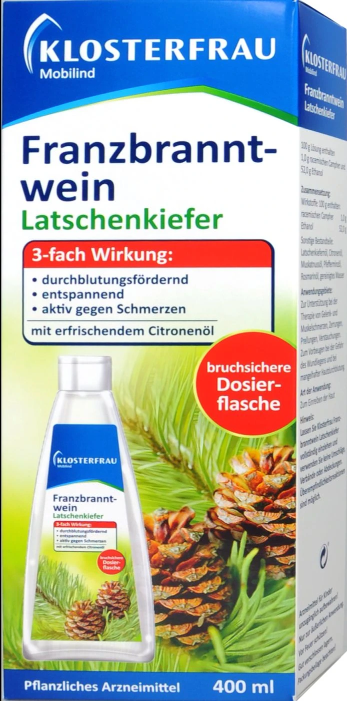 Klosterfrau Franzbranntwein mit Latschenkiefer ist ein pflanzliches Arzneimittel zum Einreiben der Haut.