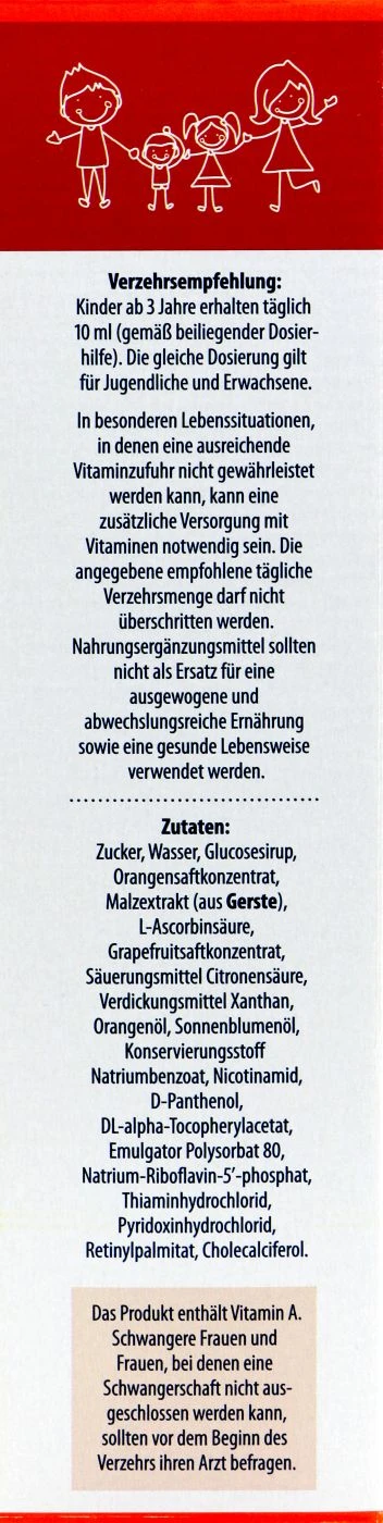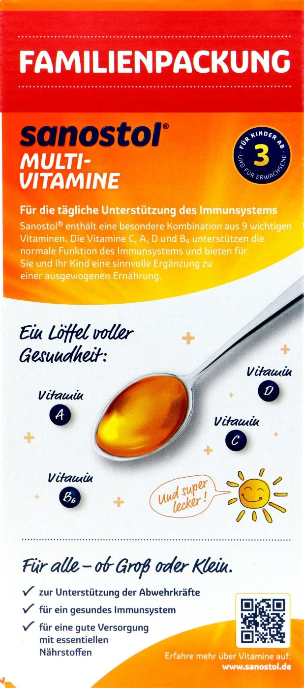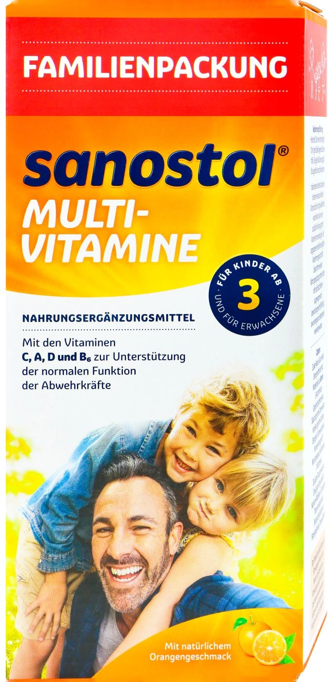 Sanostol Multivitamine ist ein Nahrungsergänzungsmittel für Kinder und Erwachsene. Die vielen Vitamine, wie Vitamin A, C, B und D unterstützen das Immunsystem und tragen zu einer starken Abwehr bei. Die Multivitamine sind in Form eines Sirups und schmecken fruchtig gut.