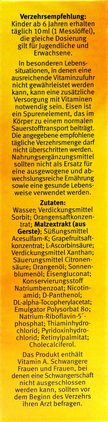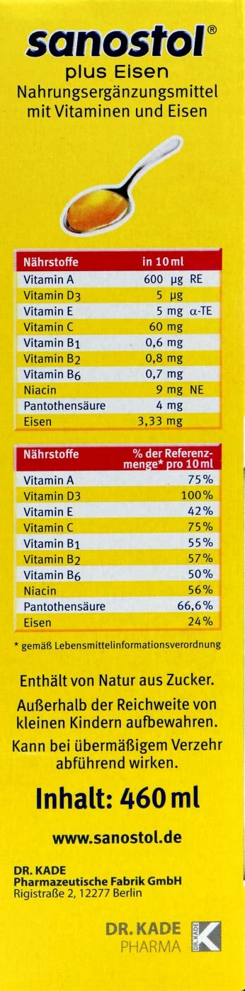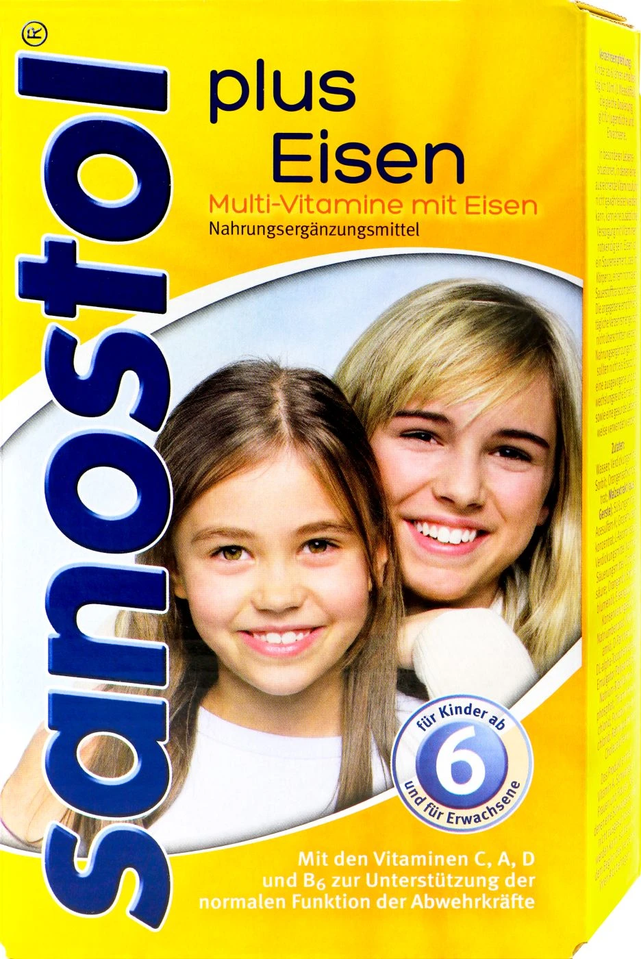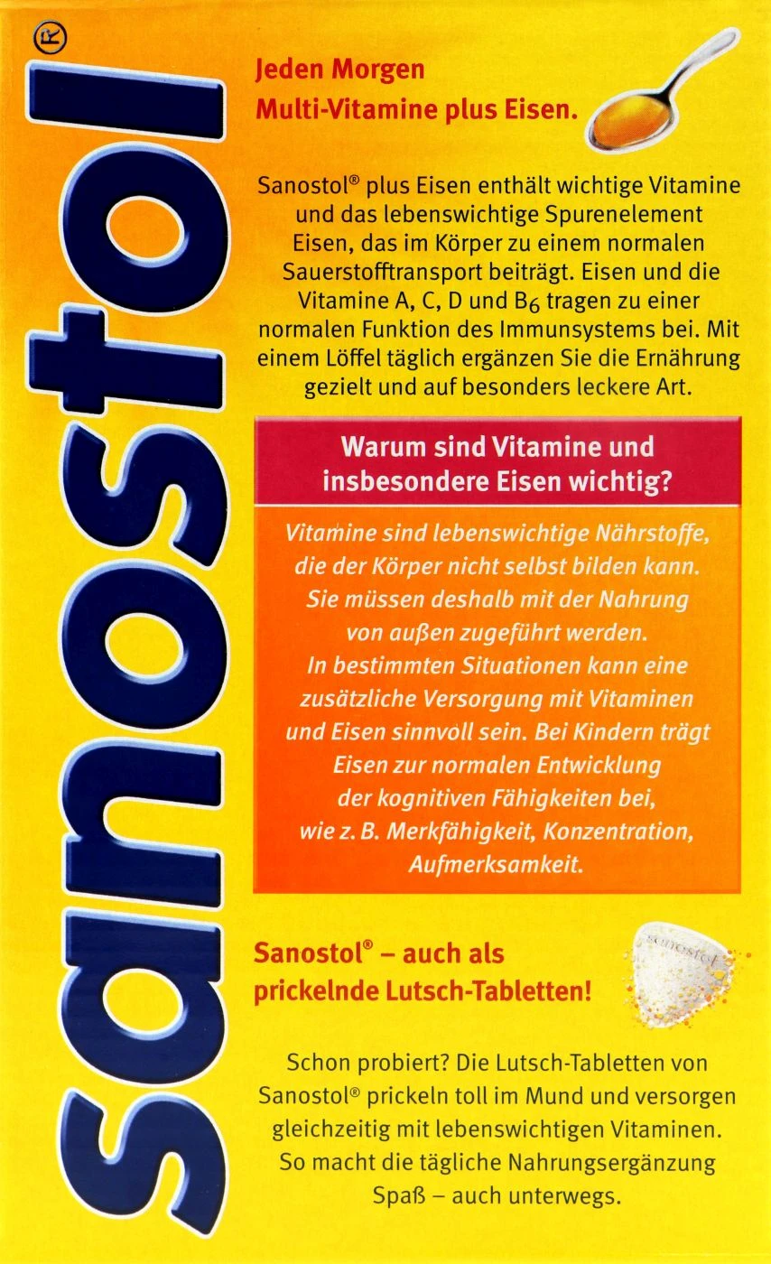 Mit Sanostol Multivitamin plus Eisen das Immunsystem unterstützeSanostol Multivitamin plus Eisen ist ein mit Vitaminen und dem Spurenelement Eisen angereichertes Nahrungsergänzungsmittel für Kinder ab 6 Jahre und Erwachsene. Eisen ist im Körper dafür zuständig, Sauerstoff zu binden und zu transportieren. Außerdem unterstützt es die Bildung der roten Blutkörperchen. Vitamine und Eisen sind wichtig, um das Immunsystem zu stabilisieren und die Abwehrkräfte aufrechtzuerhalten. Gerade in der Wachstumsphase benötigen Kinder und Jugendliche mehr Eisen, um Muskeln aufzubauen. Mädchen weisen zudem einen höheren Bedarf an Eisen auf, wenn die Regelblutung einsetzt. Sanostol Multivitamin plus Eisen unterstützt somit Kinder, die sich im Wachstum und in der Pubertät befinden, effektiv.